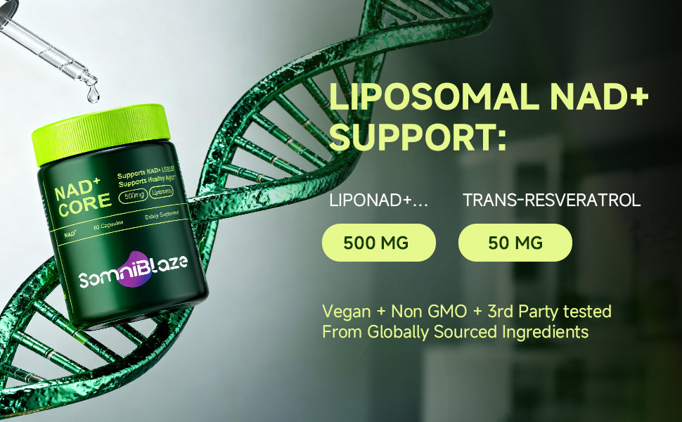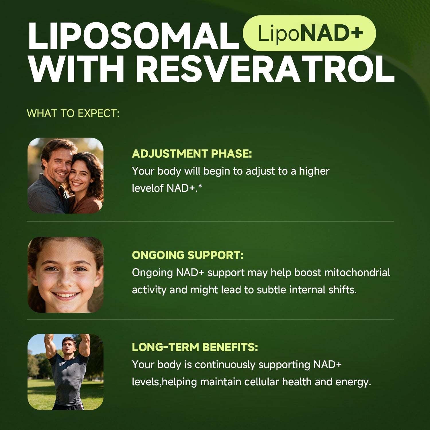 Supports Healthy Aging: Formulated with advanced Liposomal NAD+ and Resveratrol, this supplement helps enhance NAD+ absorption, supporting cellular repair, vitality, and graceful aging.